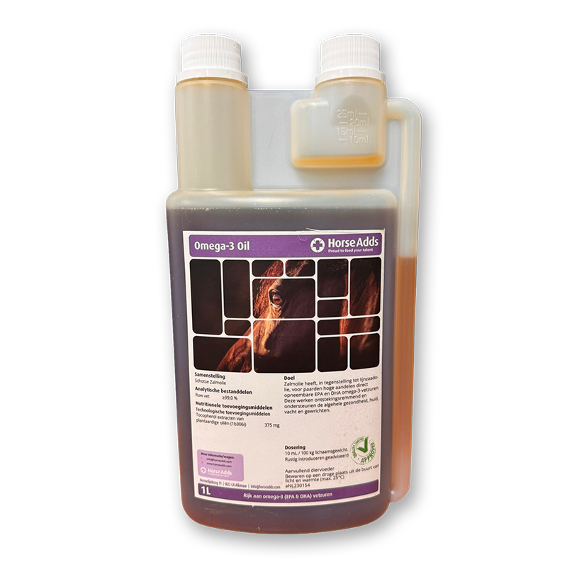 HorseAdds Omega-3 Zalmolie is een hoogwaardige bron van mariene omega 3-vetzuren. In tegenstelling tot plantaardige bronnen zoals gras of lijnzaadolie – die voornamelijk ALA (alpha-linoleenzuur) bevatten – levert zalmolie van nature direct beschikbare EPA (eicosapentaeenzuur) en DHA (docosahexaeenzuur).